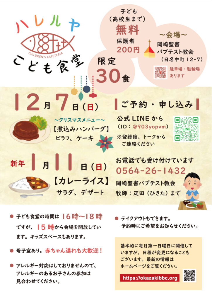 次回の子ども食堂は1月11日(日)です。利用される方は公式LINEかお電話からご予約をお願いいたします。